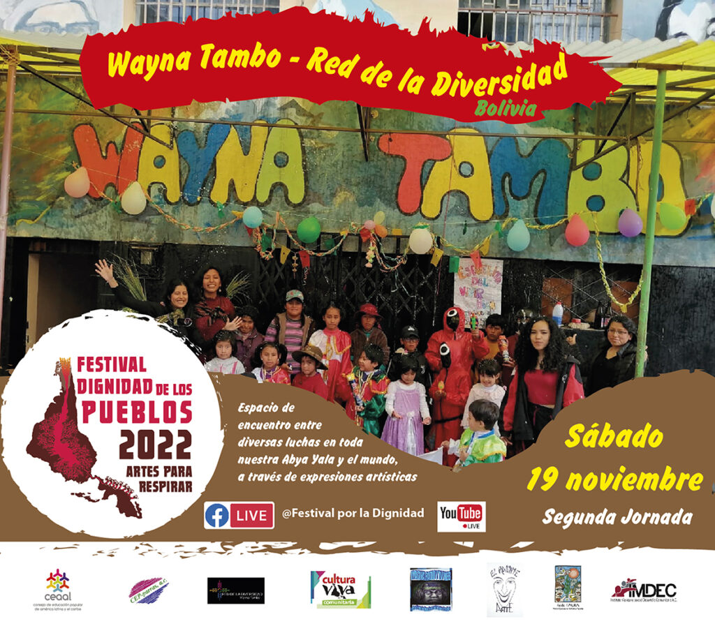 Wayna Tambo – Red de la Diversidad nace, en la ciudad de El Alto – Bolivia, a inicios de 1995. Desde entonces viene desarrollando una estrategia de comunalización y territorialidad desde acciones culturales, educativas y comunicacionales. También impulsamos la Red de la Diversidad con una docena de organizaciones hermanas en 8 regiones de Bolivia y somos parte del tejido de Cultura Viva Comunitaria. Nuestro trabajo tiene diversos procesos como la Casa de las Culturas, la Comunidad de Saberes y Aprendizajes, La Escuelita del Vivir Bien, Las Ferias Callejeras e Itinerantes, Festivales y Encuentro, la Radio Comunitaria e Intercultural, el periódico digital «Los Muros», nuestra red de tiendas o Qhatus, un sistema de Economías de Reciprocidad y Redistribución, la Productora de discos, videos y textos. los Tejidos de Cuidados, los Proyectos de gestión Comunitaria Territorial, nuestro canal de Youtube, el Museo del Barrio y otros. En esta ocasión les compartimos unas muestras del trabajo de la Escuelita del Vivir Bien realizada con niñas y niños de entre 4 y 12, parte de las familias de feriantes de Villa Dolores, en medio de la cual se encuentra nuestra Casa Wayna Tambo, así como de la propia vecindad del barrio y otras familias procedentes de diferentes lugares de El Alto. En la Escuelita se trabaja el acompañamiento pedagógico, los cuerpos y sus autonomías al mismo tiempo que sus relaciones (expresión corporal, teatro, poesía, cuentos, música, danza, ritmo, etc.), alimentación y cuidados del cuerpo, proyectos territoriales en el barrio, etc.