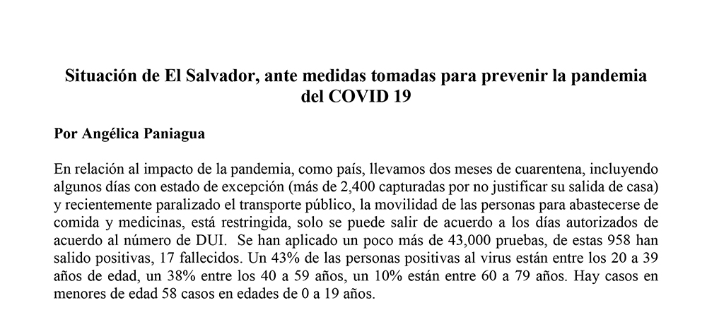 «Situación de El Salvador, ante medidas tomadas para prevenir la pandemia del COVID 19»