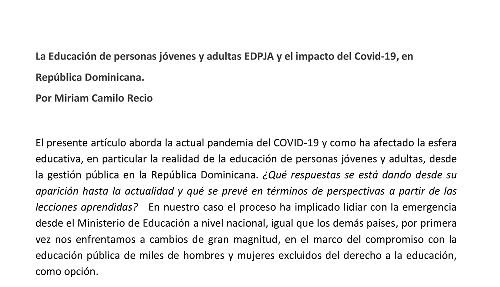 «La Educación de personas jóvenes y adultas EDPJA y el impacto del Covid-19, en República Dominicana» por Comunicación CEAAL Comunicación CEAAL 8 julio, 2020 Leave a comment on «La Educación de personas jóvenes y adultas EDPJA y el impacto del Covid-19, en República Dominicana» [siteorigin_widget class=»SiteOrigin_Widget_Button_Widget»][/siteorigin_widget] [siteorigin_widget class=»WP_Widget_Custom_HTML»][/siteorigin_widget] Comunicación CEAAL Ver contenido de Comunicación CEAAL