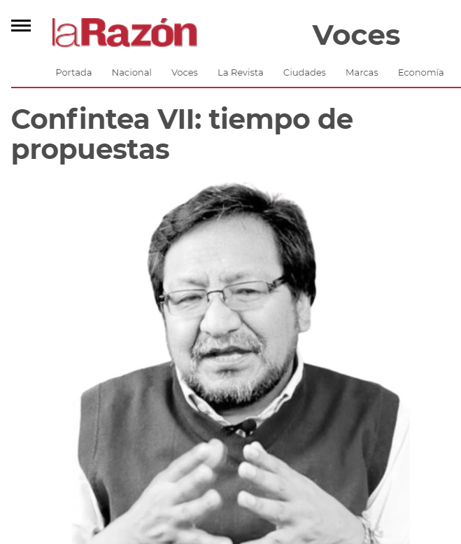 Artículo «Confintea VII: tiempo de propuestas». escrito por Noel Aguirre Ledezma, educador popular y pedagogo, publicado en el diario La Razón.