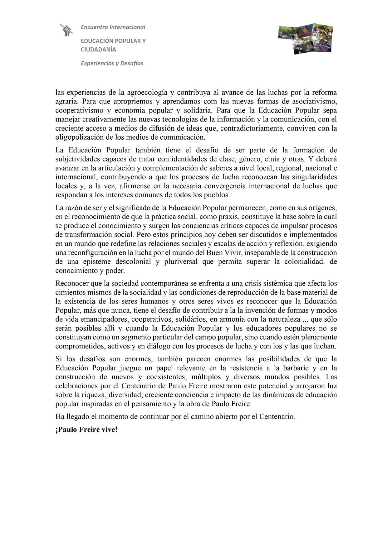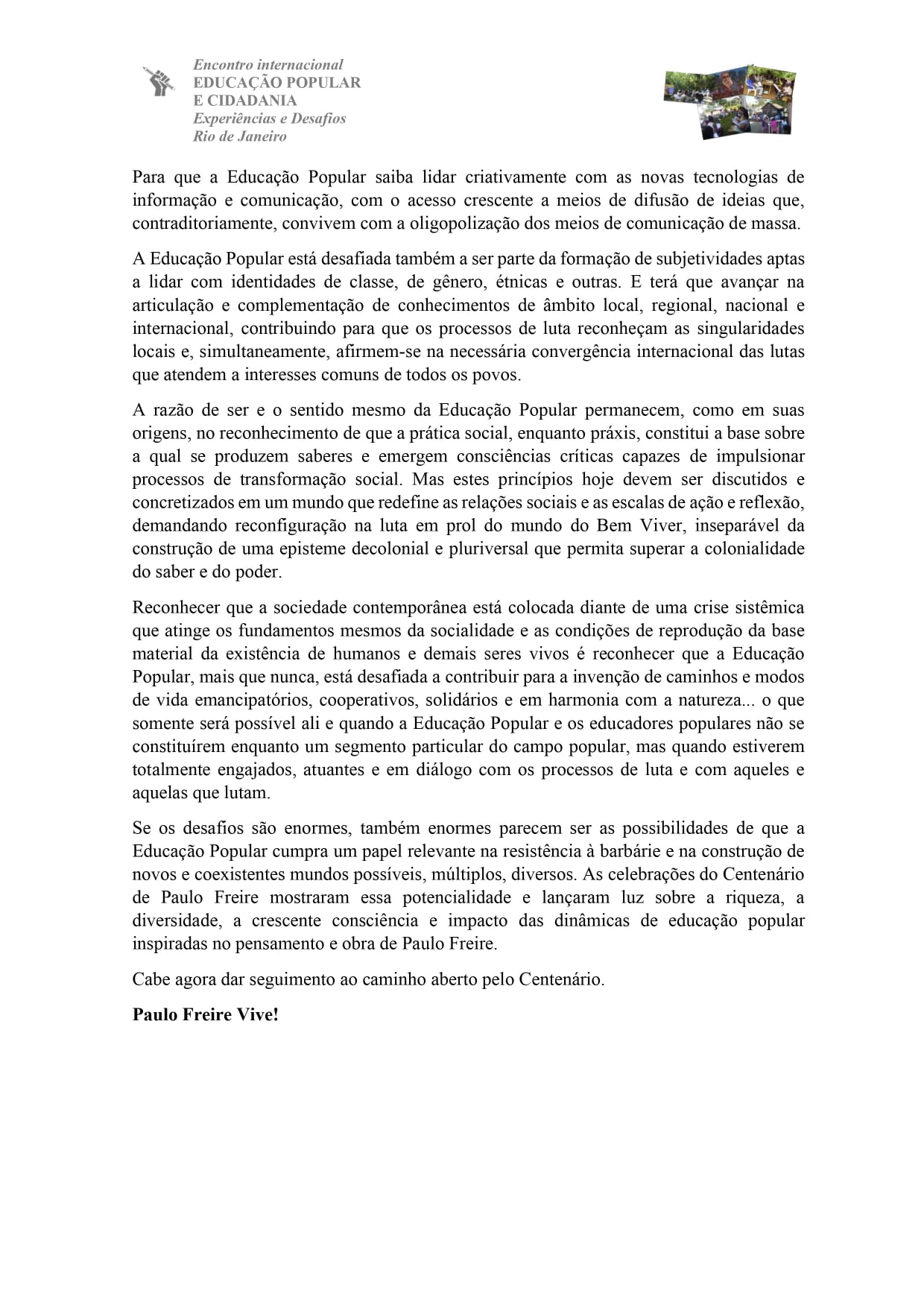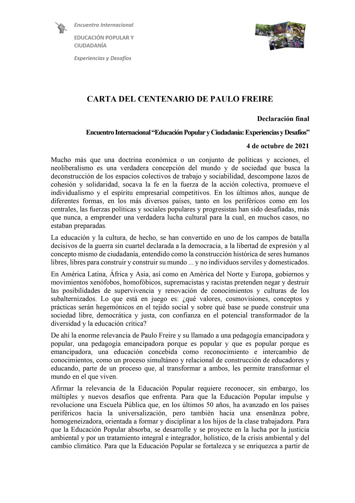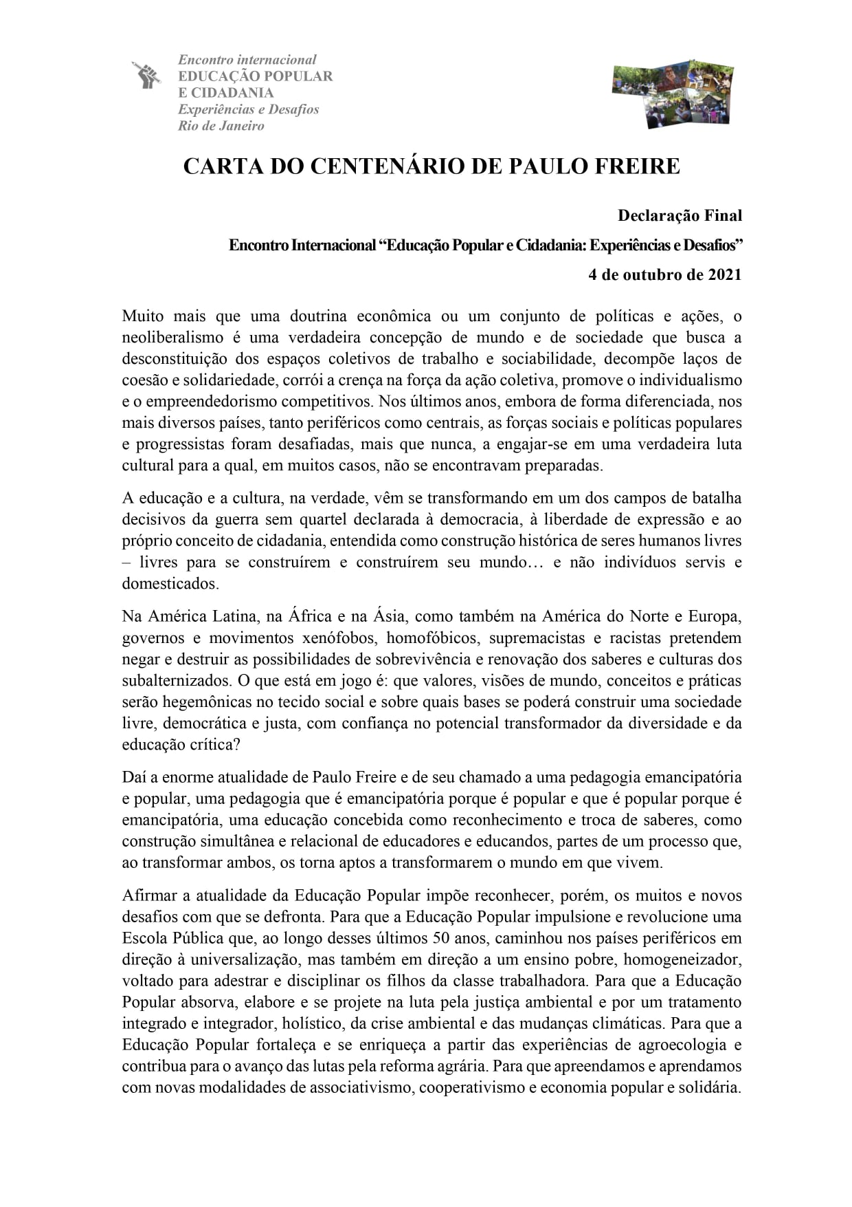 Compartimos la Carta Centenario de Paulo Freire – Declaración Final del Encuentro Internacional «Educación Popular y Ciudadanía: Experiencias y Desafíos», elaborada y aprobada en un plenario organizado por el comité organizador del evento.