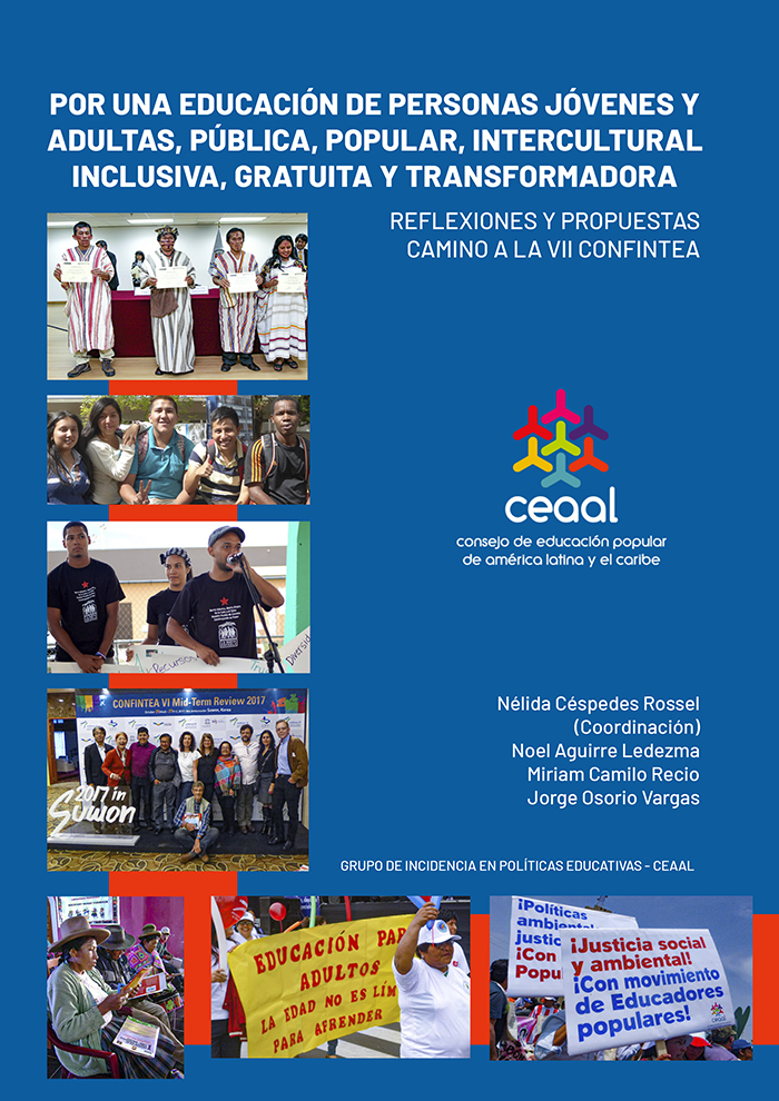 Por una educación de jóvenes y adultos pública, popular, intercultural, transformadora, inclusiva y gratuita. Reflexiones y propuestas camino a la VII CONFINTEA, es una publicación del Consejo de Educación Popular de América Latina y el Caribe, desarrollado por el Grupo de Incidencia en Políticas Educativas/GIPE, bajo la responsabilidad de Nélida Céspedes, Miriam Camilo, Noel Aguirre, Jorge Osorio.
