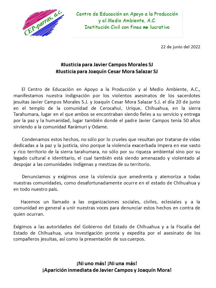 Comunicado del Centro de Educación en Apoyo a la Producción y al Medio Ambiente, A.C., (CEP Parras) en solidaridad y justicia sobre los asesinatos de los sacerdotes jesuitas Javier Campos Morales S.J. y Joaquín Cesar Mora Salazar S.J.