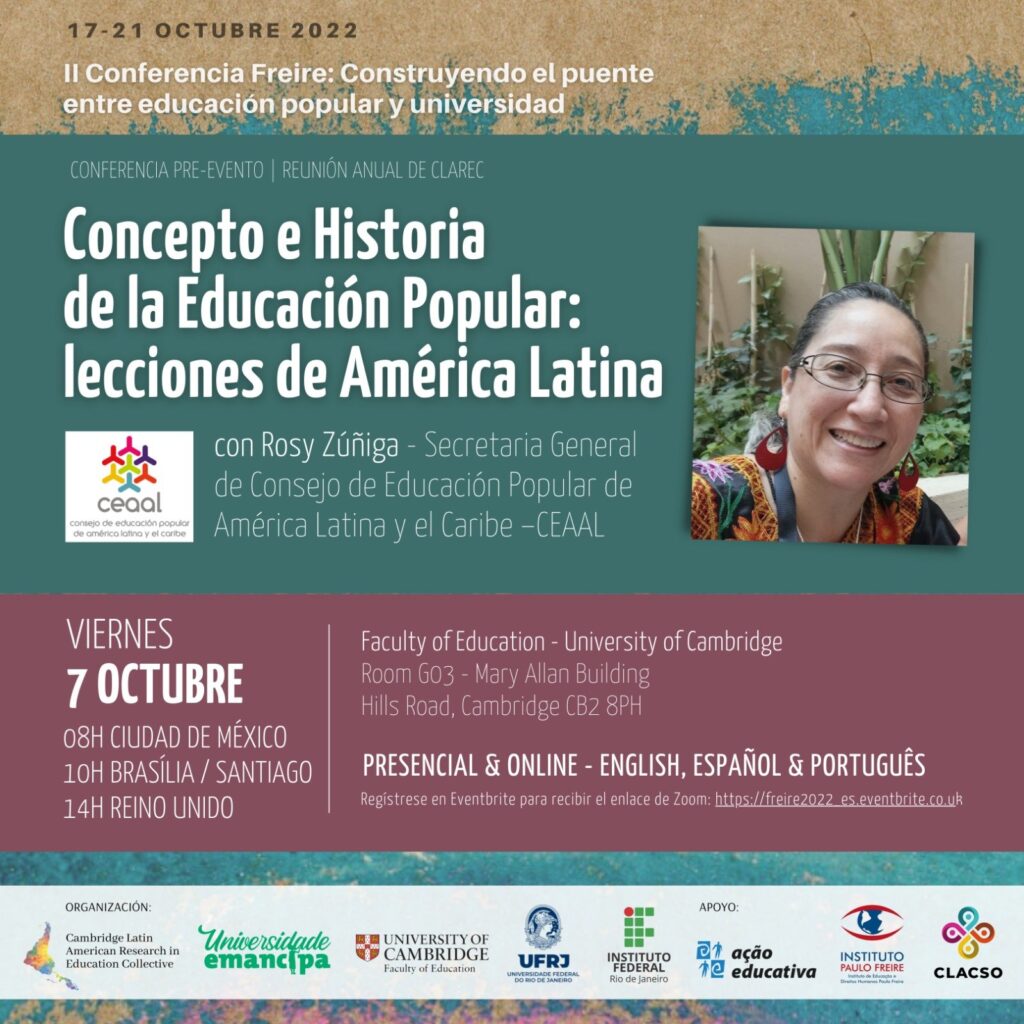 Conferencia Concepto e Historia de la Educación Popular: Lecciones de América Latina, con Rosy Zúñiga, secretaria general del CEAAL, como actividades previas a la ‘’II Conferencia Freire: construyendo el puente entre educación popular y universidad’’ el cual tomará lugar entre el 17 y 21 de octubre 2022 en la Facultad de Educación de la Universidad de Cambridge, la Universidad Federal de Río de Janeiro (UFRJ) y de manera online, organizada por el Colectivo Latinoamericano de Investigación en Educación (CLAREC) y la Universidade Emancipa (CLAREC) y Universidade Emancipa.