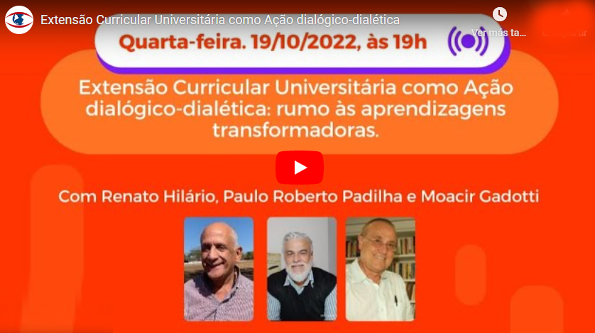 Na quarta-feira, dia 19/10 aconteceu um encontro do ‘Projeto de Formação Extensão Universitária em Movimento’: Extensão Curricular Universitária como Ação dialógico-dialética: rumo às aprendizagens transformadoras, com os docentes convidados: Moacir Gadotti (Instituto Paulo Freire), Renato Hilário (GENPEX/FE/UNB-CEDEP) e mediação de Paulo Roberto Padilha (Instituto Paulo Freire).