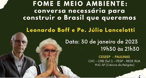 Conversa necessária sobre: FOME e Meio AMBIENTE e os desafios para construir o Brasil que queremos! Assessoria de Leonardo Boff e Pe. Julio Lancelotti Mediação: Pe. José Oscar Beozzo (coordenador geral do CESEEP) Evento realizado dia 30 de janeiro de 2023, em Auditório da Livraria Paulinas. Rua Domingos de Moraes, 660 – São Paulo-SP.