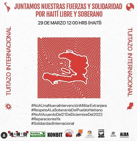 Este 29 de Marzo en el marco de un nuevo aniversario de la constitución haitiana que fue creada producto de una inmensa movilización popular que llevó al derrocamiento de la dictadura de la familia Duvalier, las organizaciones haitianas y numerosas redes de solidaridad con la lucha del pueblo haitiano a nivel regional y global convocamos a la Jornada Internacional ¡Solidaridad y justicia por Haití! con una serie de actividades para denunciar los actuales intentos de intervención sobre el territorio haitiano, así como rechazar el gobierno de facto y violador de Derechos Humanos de Ariel Henry. #HaitíDignoLibreSoberano #NoAUnaNuevalntervenciónMilitar #RespetoALaSoberaníaDelPuebloHaitiano #ReparacionesYa