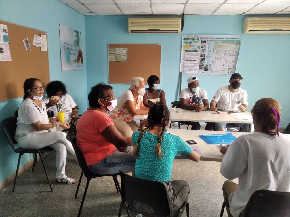 Surgió como preparación al grupo territorial, como se le ha denominado al equipo de trabajo de las comunidades en este proyecto, el Curriculum GlobALE, preparación en diversos temas afines al trabajo en comunidades con énfasis en temáticas asociadas al cambio climático y peligro, vulnerabilidad y riesgo (PVR); este programa modular además de ofrecer conocimientos, permitió que el grupo de cada municipio se integrara y además intercambiara con los territorios, enriqueciendo los saberes de todos. En el caso de La Habana del Este el grupo estaba compuesto por personas con experiencia en procesos y proyectos comunitarios y ya existían puntos de contacto por haber en algún momento coincidido en acciones conjuntas, todas residentes del territorio y tres de las ocho, de este Consejo Popular Camilo Cienfuegos. En este periodo se construyeron códigos comunes y se identificaron potencialidades de cada una lo que permitió la asignación de roles ante cada tarea. También surgieron y se fortalecieron afectos, elemento que favorece el trabajo colectivo.