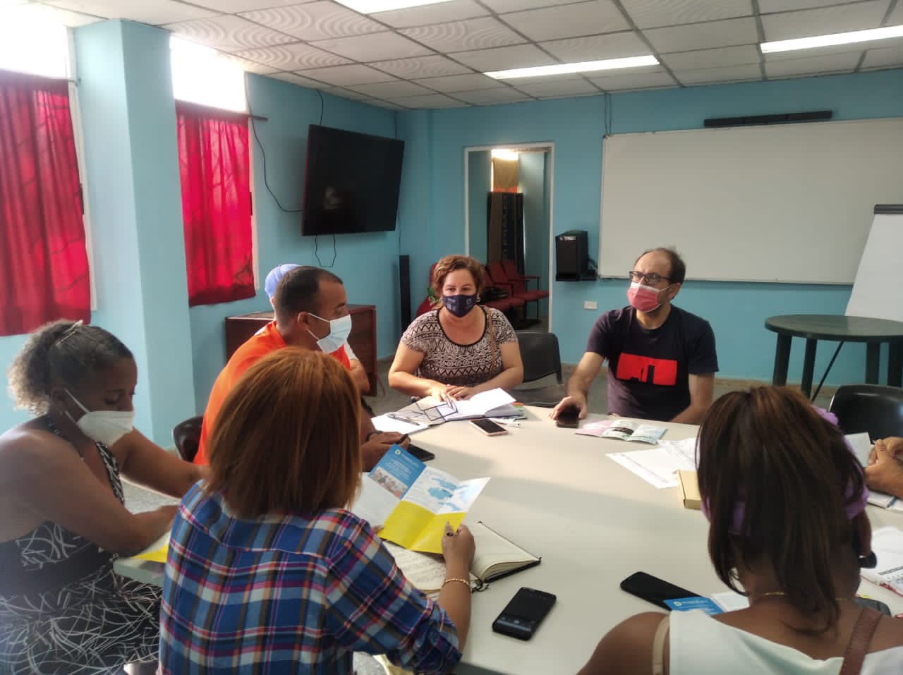 Las acciones continuaron con un acercamiento a Promotores de Proyectos Comunitarios, a solicitud del presidente del Consejo Popular Camilo Cienfuegos, desde cuyas experiencias se promueven actividades de mejoramiento ambiental. Entre los Promotores se encentraban representantes del proyecto “Diente de perro,” que incorpora niños y niñas, adolescentes y jóvenes de la zona dedicados en jornadas de trabajo voluntario a MANTENER LIMPIA LA ZONA LITORAL; Luis Miguel, un Parcelero en la circunscripción 14, que reclama la NECESIDAD DE ARMONIZAR LAS ÁREAS COMUNES que han sido cerradas y de insertar al servicio de la comunidad a otros parceleros; Caridad con su propuesta de RECICLEJE y Emilio, con sus juegos didácticos para niñas y niños. En el intercambio todos los participantes expresaron sus inquietudes sobre sus propuestas de trabajo en la comunidad y la manera de viabilizarlas. En este encuentro también se planteó la inquietud sobre la importancia de involucrar a empresas insertadas en la comunidad y comprometerlas con la recuperación de su entorno, se valoró la responsabilidad social empresarial que deben asumir y la invitación para convocarlas a este espacio, aunque son pocas y pequeñas, la mayoría cuenta propistas. A partir de sus inquietudes se identifican necesidades de capacitación en concordancia con los temas propuestos y se deja abierto a otros que pueden surgir de la comunidad. Este intercambio marco pautas para las posteriores propuestas como Iniciativas de adaptabilidad al Cambio Climático.