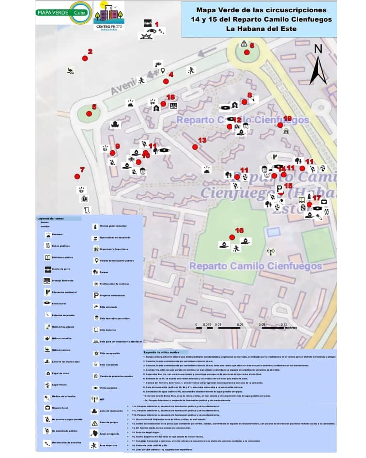 En el 2do encuentro ya como parte del inicio de la práctica del diagnóstico del área ya seleccionada como de mayor riesgo ante el recrudecimiento de eventos meteorológicos por peligro de inundación, en este encuentro se fue profundizando en las características del área seleccionada, basados en esa información obtenida por el grupo gestor y algunos representantes de la Universidad del Adulto Mayor del Consejo Popular Camilo Cienfuegos. Como elemento fundamental se digitalizaron los sitios verdes identificados apoyado por un trabajo de campo posterior (Anexo 1). Durante el recorrido se fueron identificando fortalezas y problemáticas que se complementaban con las voces de personas de esa área, delegadas y presidente del Consejo Popular. De gran valor fueron los testimonios de fundadores y personas que residen en este barrio desde hace muchos años, Este primer momento de recorrido e intercambio permitió la elaboración del Mapa Verde de las Circunscripciones 14 y 15.