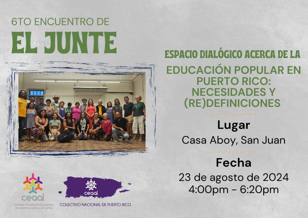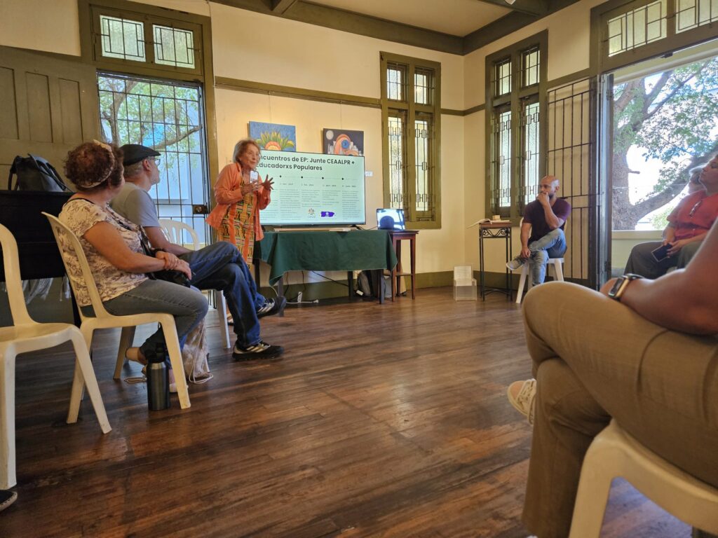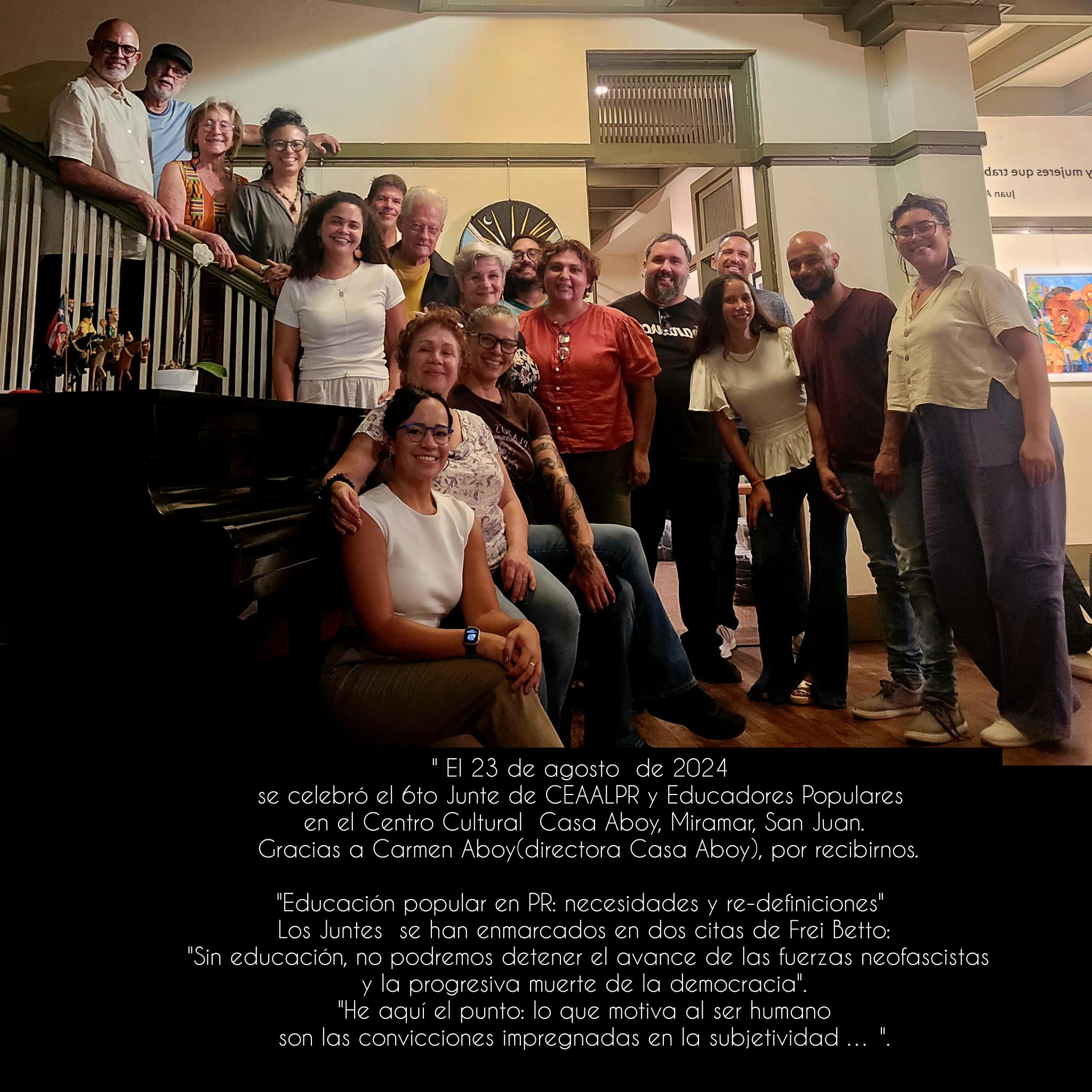 El 23 de agosto de 2024 se celebró el Sexto Junte de CEAALPR[1] y Educadores Populares en el Centro Cultural Casa Aboy, Miramar, San Juan. El tema fue “Educación popular[2] en PR: necesidades y definiciones» La actividad comenzó con un cariñoso saludo de Carmen Aboy, actual directora de la Casa Aboy. Nos indicó que nuestros objetivos eran coherentes con los de la Casa Aboy por lo que podemos contar con ese espacio para reuniones futuras.
