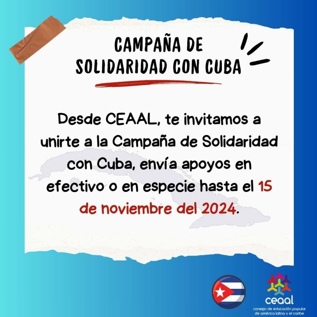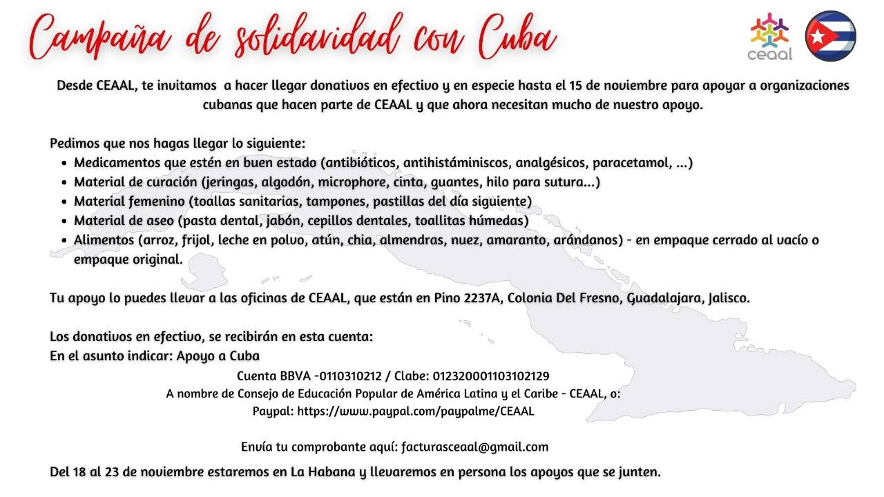Desde CEAAL, te invitamos  a hacer llegar donativos en efectivo y en especie hasta el 15 de noviembre para apoyar a organizaciones cubanas que hacen parte de CEAAL y que ahora necesitan mucho de nuestro apoyo.