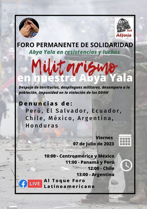 [siteorigin_widget class="WP_Widget_Custom_HTML"][/siteorigin_widget] #ForoPermanenteSolidaridad Foro Permanente de Solidaridad - Abya Yala en resistencias y luchas: "Militarismo en nuestra Abya Yala: Despojo de territorios, despliegues militares, desamparo a la población, impunidad en la violación de los DDHH" Denuncias de: Perú, El Salvador, Ecuador, Chile, México, Argentina, Honduras Red Alforja, de CEAAL Mesoamérica Al Toque Foro Latinoamericano