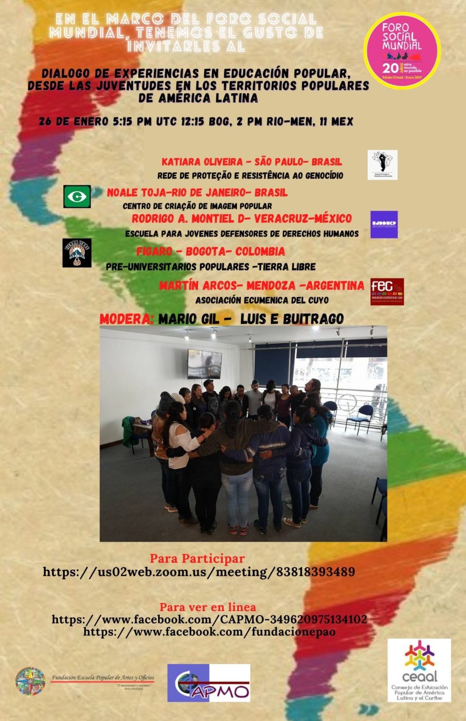 [siteorigin_widget class="WP_Widget_Custom_HTML"][/siteorigin_widget] #CEAALenFSM. Conversatorio "Mujeres territorios y resistencias: relatos de mujeres en América Latina", dentro del Foro Social Mundial 2021. 29 de enero de 2021 En el marco del Foro Social Mundial virtual de 2021, el viernes 29 de enero, se desarrolló el conversatorio “Mujeres, territorios y resistencia en América Latina”, con el objetivo de poner en diálogo las estrategias…