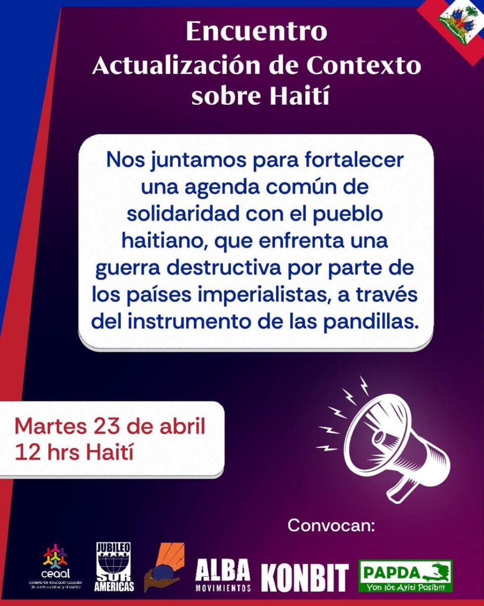 [siteorigin_widget class="WP_Widget_Custom_HTML"][/siteorigin_widget] #ConversatorioRedes y movimientos sociales en hermandad con el pueblo de Haití convocaron al conversatorio: *Actualización del Contexto sobre Haití *, que se realizó el 23 de abril de 2024. El cual fue transmitido por CEAALtv.Tendremos un espacio con organizaciones haitianas para:Actualización del contexto del país,Coordinar acciones internacionales de solidaridad,Definición de acciones enmarcadas en los 220 años de la…