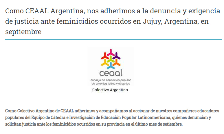 Como Colectivo Argentino de CEAAL adherimos y acompañamos al accionar de nuestres compañeres educadores populares del Equipo de Cátedra e Investigación de Educación Popular Latinoamericana, quienes denuncian y solicitan justicia ante los feminicidios ocurridos en su provincia en el último mes de setiembre.