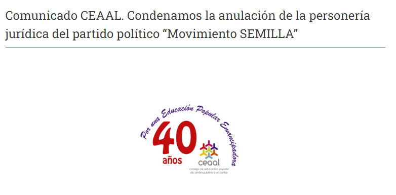 Desde el Consejo de Educación Popular de América Latina y el Caribe – CEAAL, condenamos la anulación de la personería jurídica del partido político «movimiento SEMILLA», es un hecho que atenta contra los derechos políticos del partido y de la voluntad popular del pueblo de Guatemala. Exigimos el respeto a la voluntad popular y el buen desarrollo de la segunda vuelta, programada para el 20 de agosto.