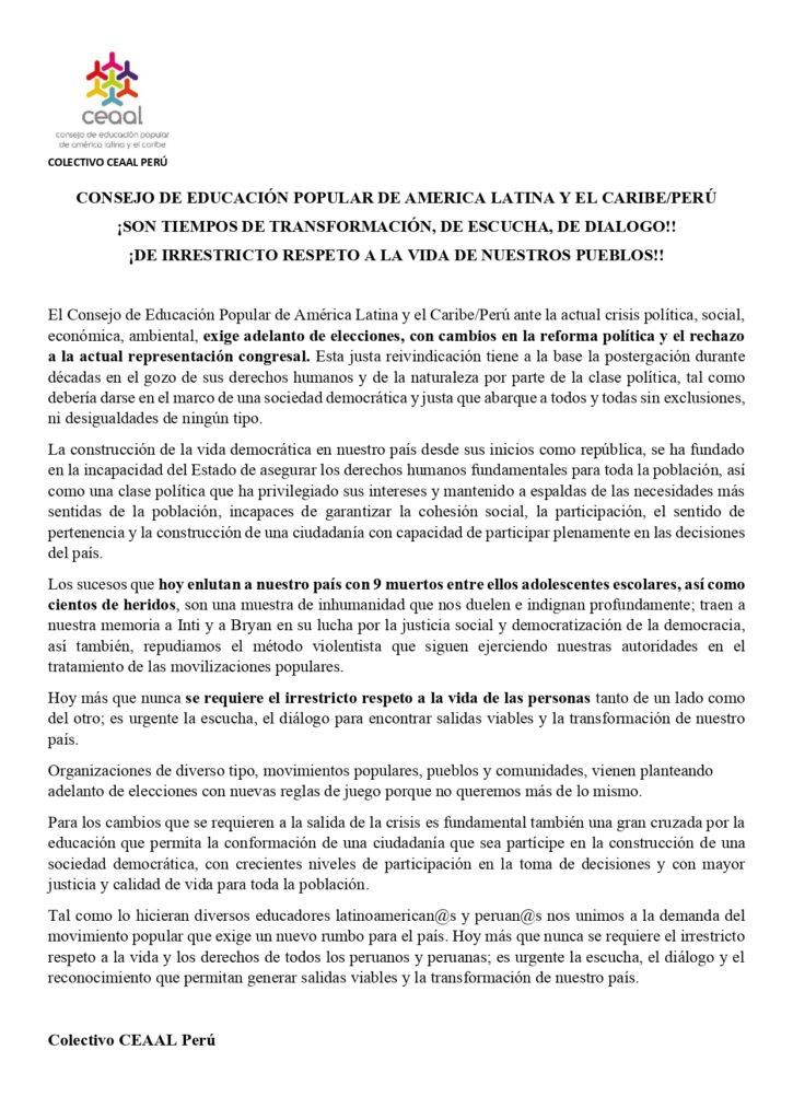 Comunicado CEAAL Perú. ¡Son tiempos de transformación de escucha, de diálogo! ¡De irrestricto respeto a la vida de nuestros pueblos!