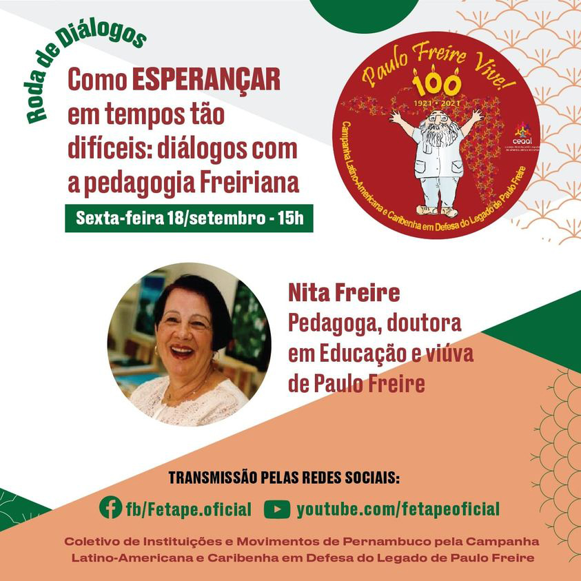 A roda de diálogo será um momento em que educadores e educadoras populares de diversos movimentos de Pernambuco irão a partir de suas práticas responder: Como ESPERANÇAR em tempos tão difíceis? Em um diálogo com a pedagoga Nita Freire, que irá conversar como Paulo Freire responderia aos desafios postos na atual realidade de avanço do fascismo e do conservadorismo em meio à crise econômica e sanitária mundial.