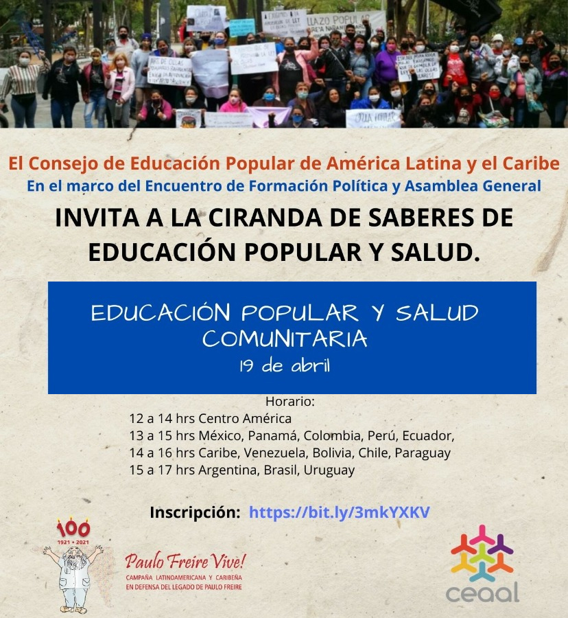 Este Cíclo de «Ciranda de Saberes en Educación Popular y Salud», forma parte del Eje 9 (Educaciones Populares en torno al cuidado de la vida, la preservación de la salud y las políticas de seguridad social), en el marco del Encuentro de Formación Política (EFP) y Asamblea General del CEAAL 2021.