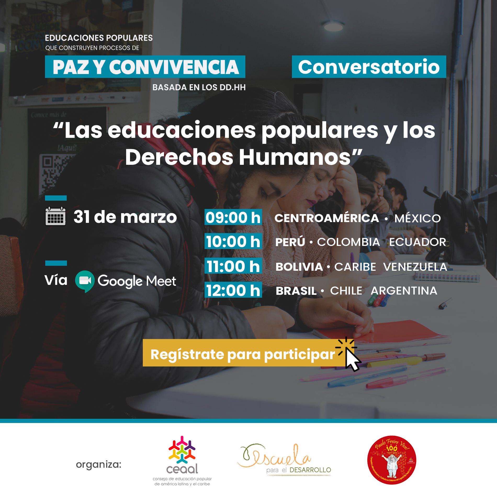 Bienvenidas y bienvenidos al segundo Conversatorio Internacional «Las educaciones populares y los Derechos Humanos», organizado por el Consejo de Educación Popular de América Latina y el Caribe y Escuela Para El Desarrollo.