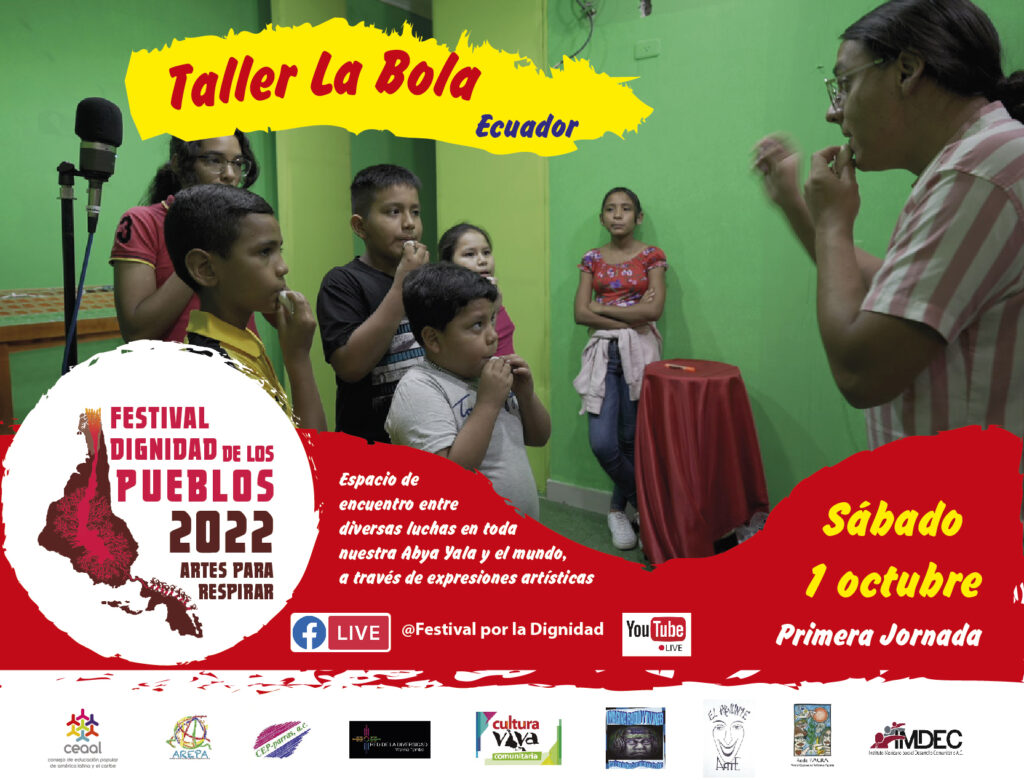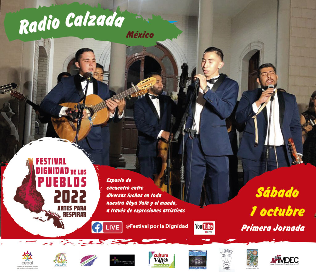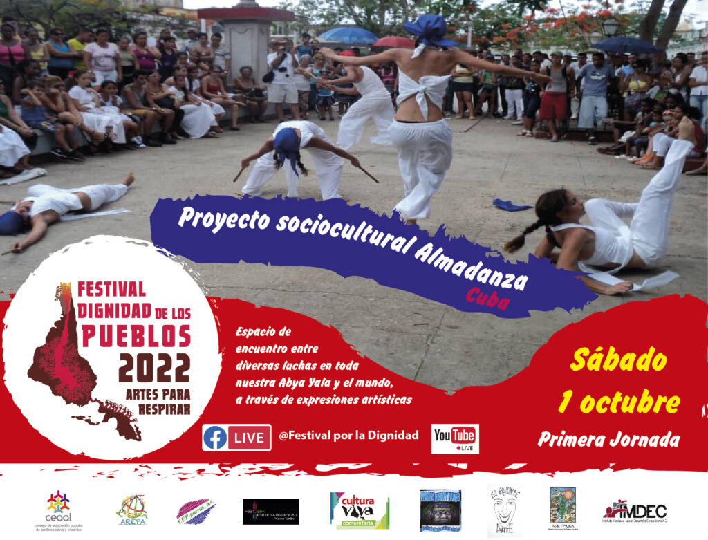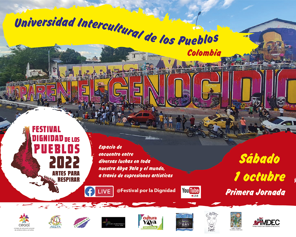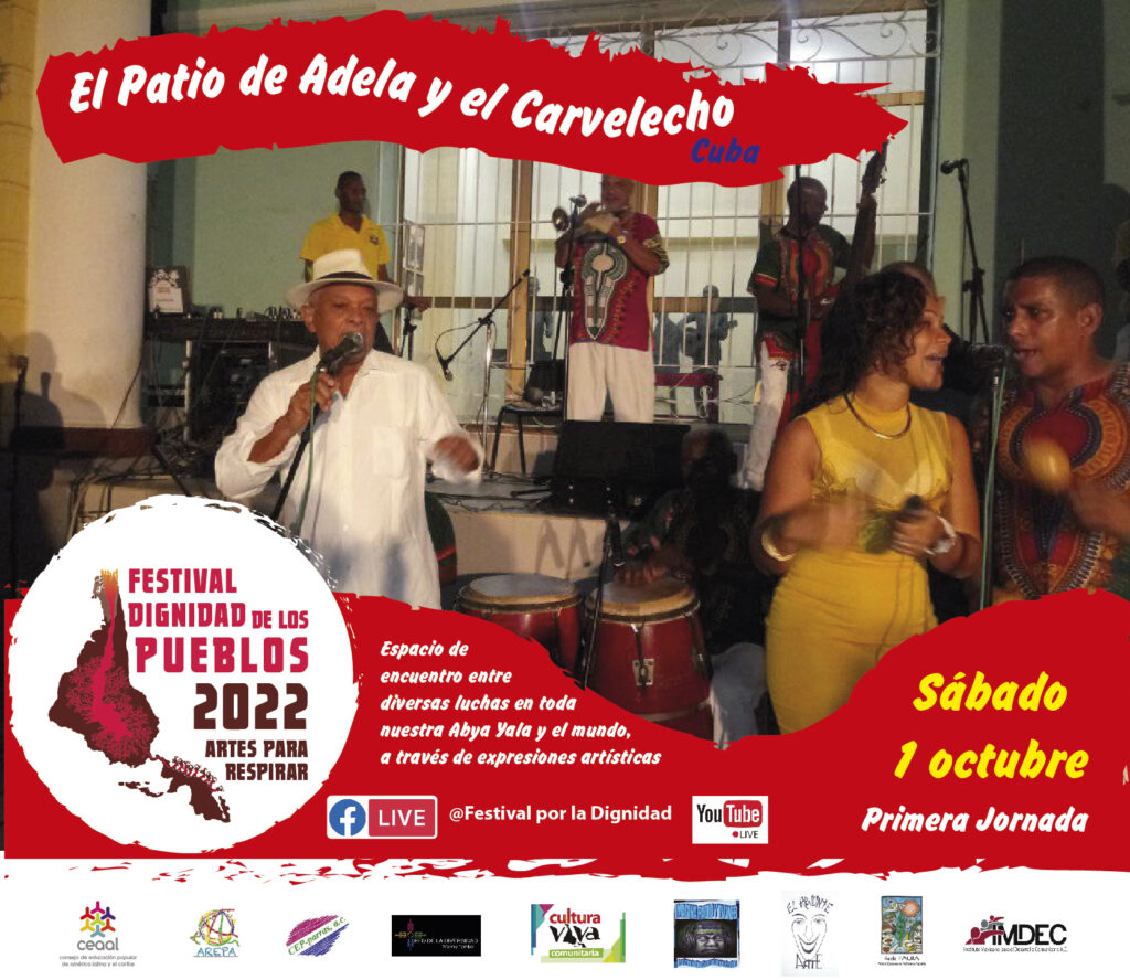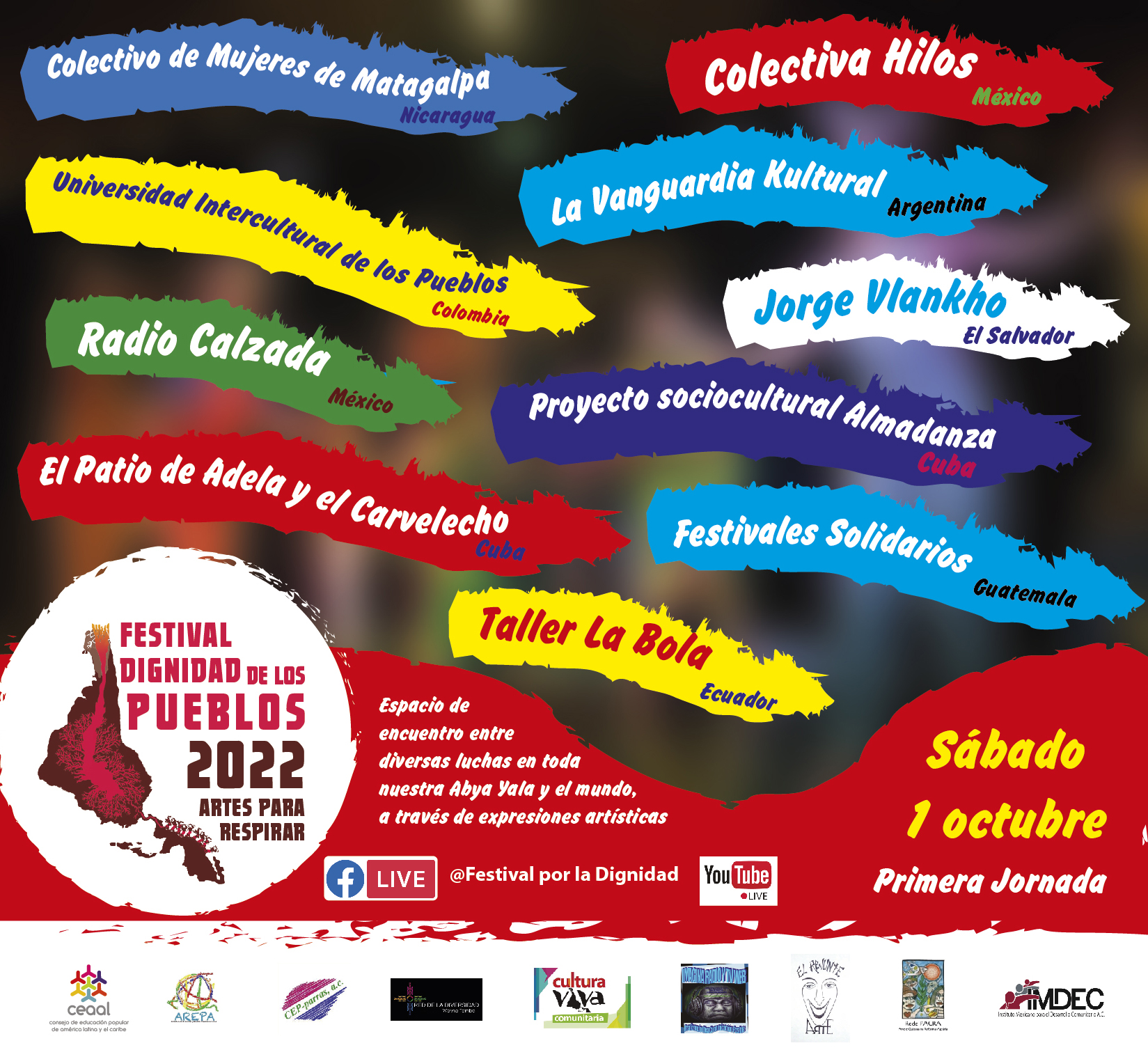 Este  sábado 1 de octubre se llevará a cabo la primera jornada del Festival por la Dignidad de los Pueblos 2022. Artes para Respirar, el próximo, a través de Facebook Live (https://www.facebook.com/FestivalPorLaDignidad) y You Tube Live (https://www.youtube.com/festivalporladignidad)