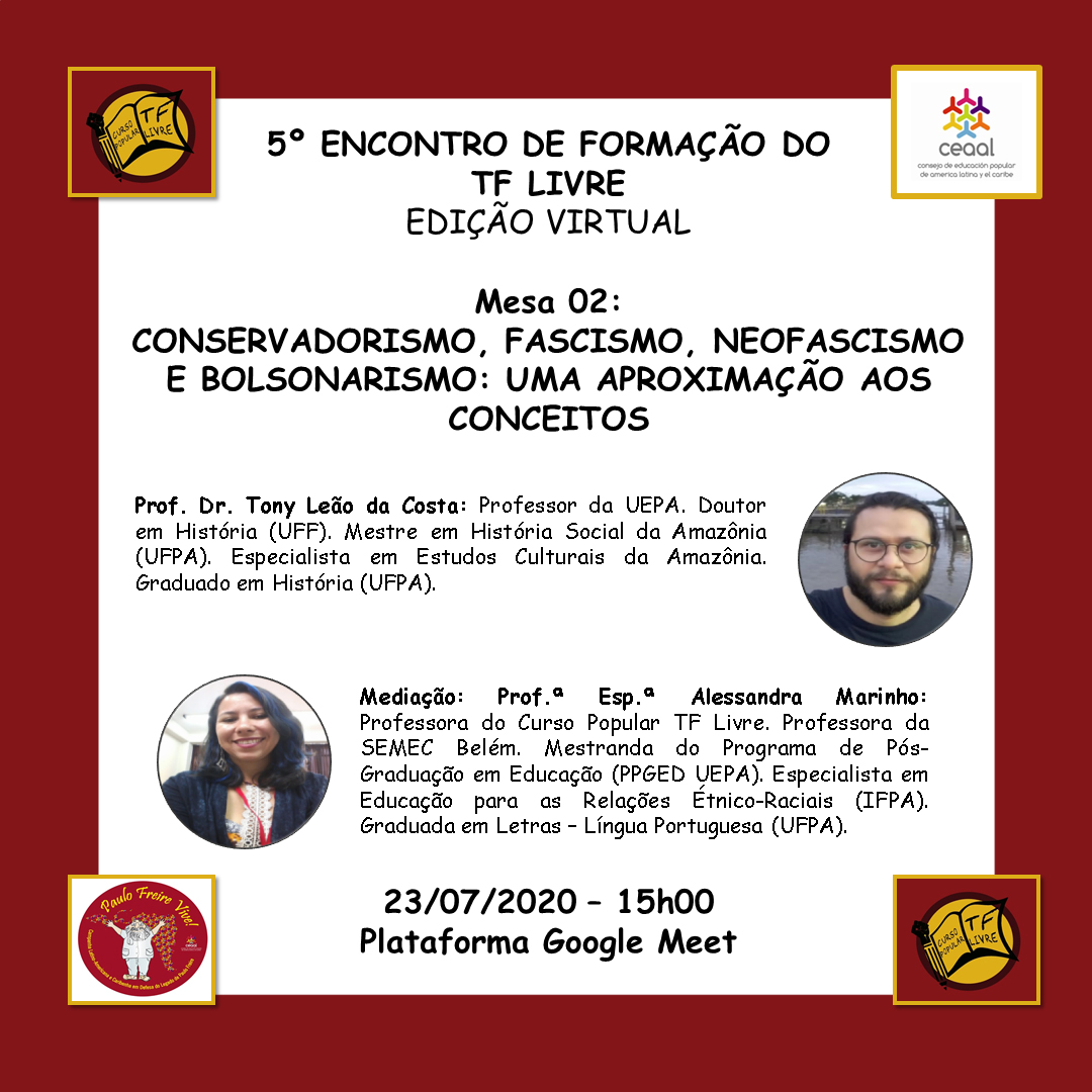 Após o sucesso da primeira mesa, nosso Encontro continua na mesa 02, cujo tema será : Conservadorismo, Fascismo, Neofascismo e Bolsonarismo: uma aproximação aos conceitos. Com o Prof. Dr. Tony Leão (Coordenador do TF Livre e Professor da UEPA) como expositor e com a Prof.ª. Esp. Alessandra Marinho (Professora do TF Livre, da SEMEC e Mestranda em Educação da UEPA) como mediadora.