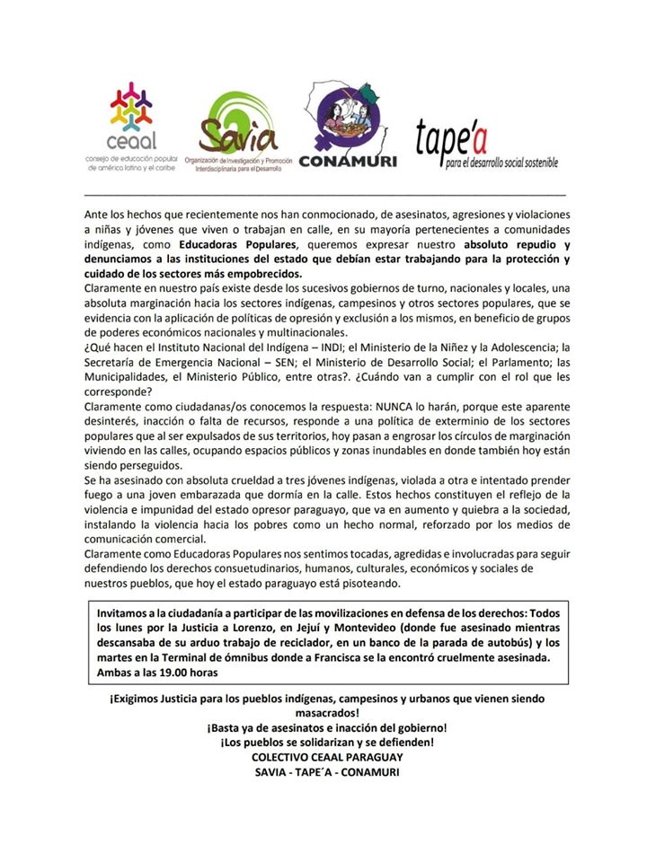 Desde el Consejo de Educación Popular de América Latina y el Caribe (CEAAL) repudiamos el asesinato y las violaciones de niñas y adolescentes indígenas de Paraguay. Pedimos se tomen las medidas necesarias para que esta terrible realidad no siga aconteciendo.