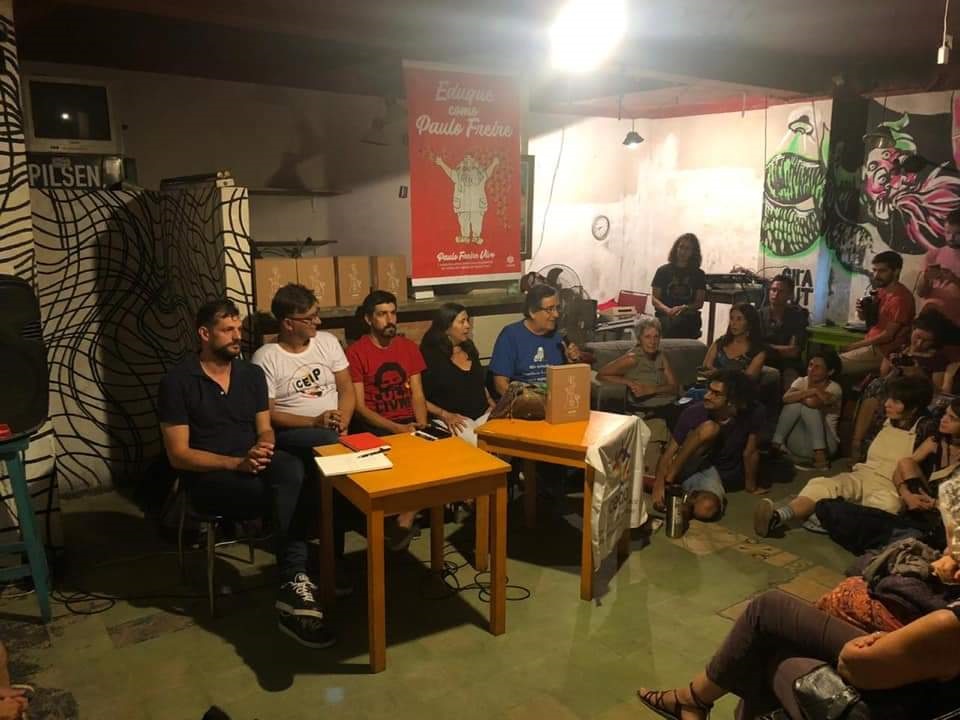 La convocatoria tenía como elemento central la presentación de dos libros, uno de lo/as compñaero/as de Argentina, de CEIP “Educaciones populares y pedagogías criticas” a cargo de Frenando Lazaro y Ezequiel Alfieri que además hicieron una breve exposición de la experiencia de los Bachilleratos Populares en América Latina. Sumado a esto, se presento la experiencia de SalaSur a cargo de Pilar Ubilla y un video que daba cuenta de esa experiencia.
