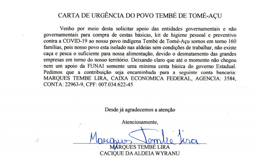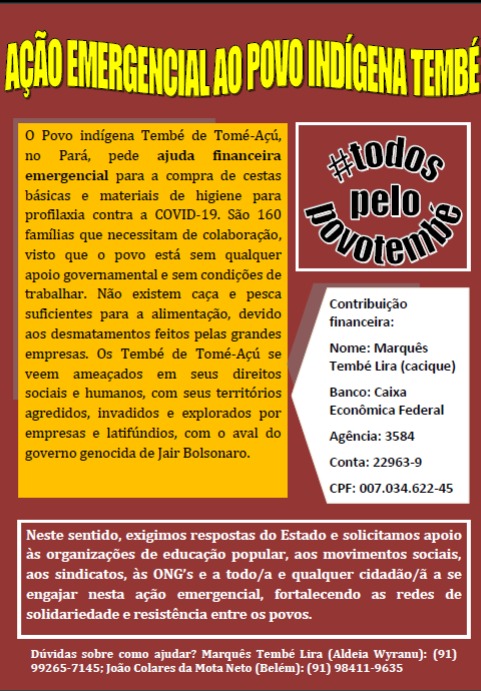 Ao mesmo tempo em que reafirmamos a exigência do Povo Tembé de que os governos federal, estadual e municipal atuem para garantir políticas de saúde, assistência e proteção social, reforçamos o pedido do Povo Tembé de colaboração de organizações não governamentais nesta ajuda financeira emergencial.