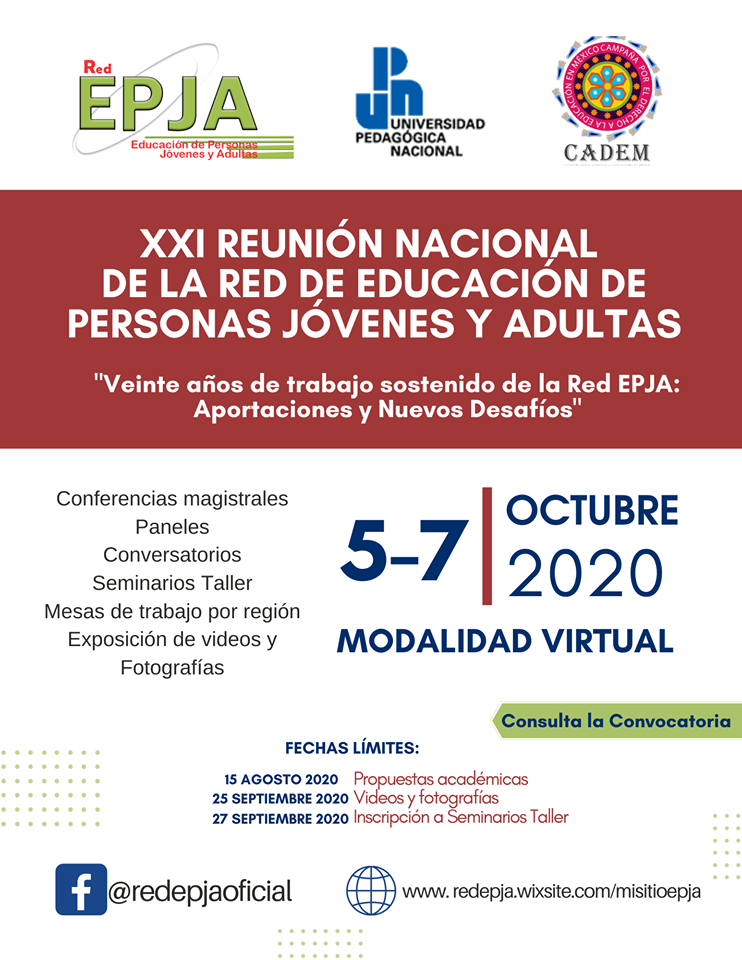 Se les invita a participar en la XXI Reunión Nacional de la Red de Educación para Personas Jóvenes y Adultas (Red EPJA), en México, que se realizará del 5 al 7 de octubre, en su modalidad virtual.