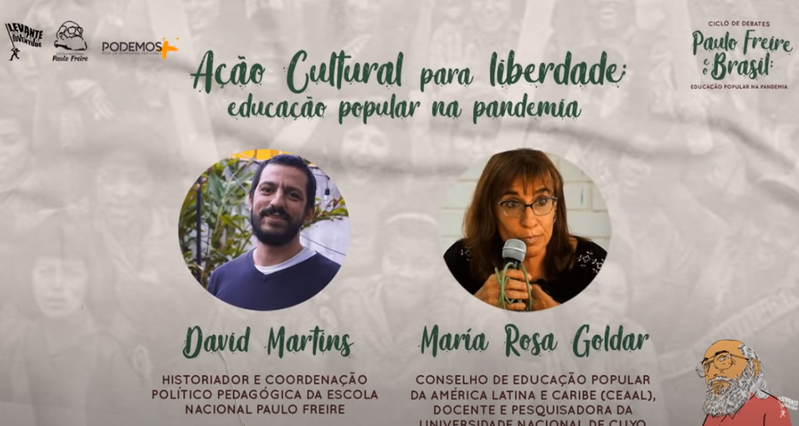 «Ação Cultural para liberdade: educação popular na pandemia» com dois convidados muito especiais: David Martins, que é historiador e membro da Coordenação político pedagógica da Escola Nacional Paulo Freire; e María Rosa Goldar (Mendoza, Argentina) do Conselho de Educação Popular da América Latina e Caribe (CEAAL), docente e pesquisadora da Universidade Nacional de Cuyo.