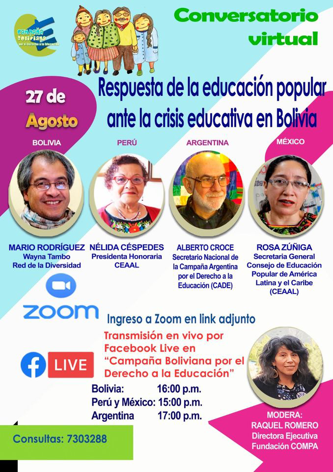 El 27 de agosto de 2020, la Campaña Boliviana por el Derecho a la Educación (CBDE) realizó el Conversatorio Virtual: “Respuesta de la educación popular ante la crisis educativa en Bolivia”.