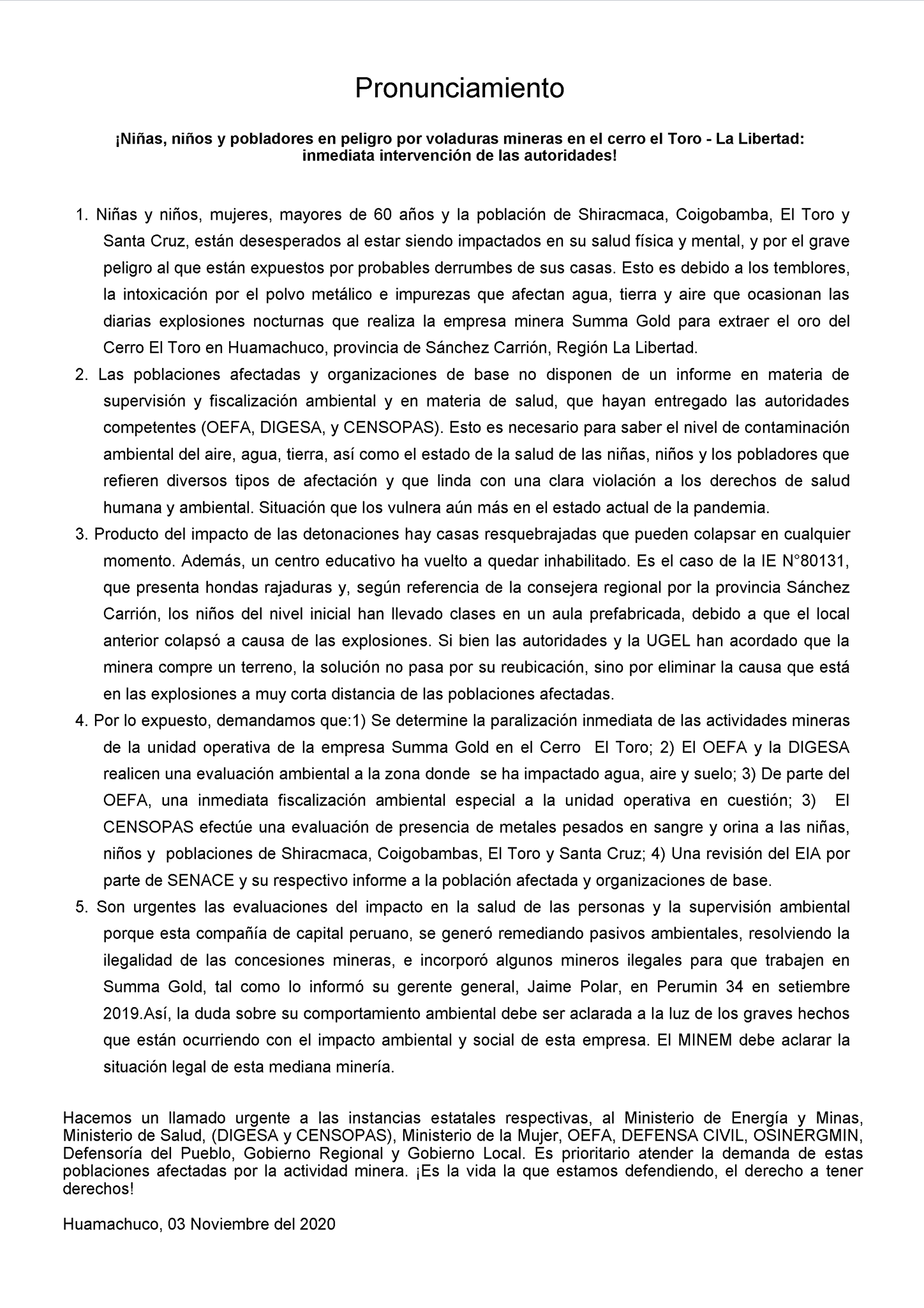¡Pronunciamiento. «Niñas, niños y pobladores en peligro por voladuras mineras en el cerro El Toro-La Libertad: inmediata intervención de las autoridades de Perú!»