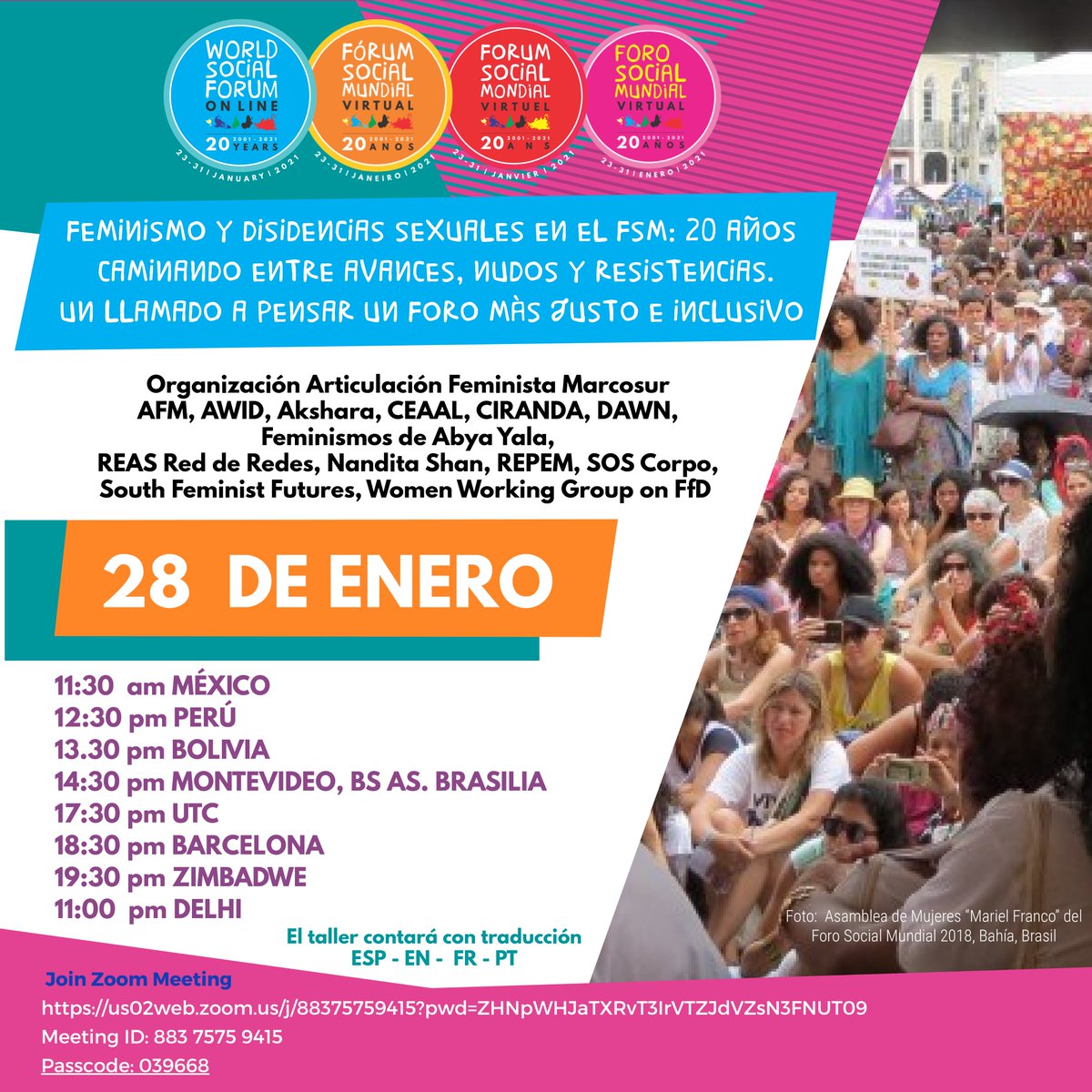 Es un espacio para analizar la participación y la contribución de las mujeres y de las feministas desde el nacimiento del Foro en 2001. Desde el movimiento #Metoo, al Ni una Menos y la Marea Verde en Argentina o al poderoso “ Un Violador en tu camino que nació en Chile y resonó en México, Colombia, Francia, España y en todo el mundo. Existe un consenso de que los feminismos son uno de los principales actores políticos. Un grupo de organizaciones nos estamos auto convocando para crear espacios de reflexión sobre las siguientes cuestiones: ¿De dónde venimos? ¿ Cuáles han sido los desafíos y los avances de las feministas y de los movimientos de mujeres en estos 20 años desde el nacimiento del FSM? ¿Cómo podemos fortalecer el foro como proceso en su lucha anticapitalista contra el patriarcado, el racismo y el colonialismo? ¿Cuáles son los desafíos, los espacios y las oportunidades para continuar avanzando? ¿Dónde queremos estar en este proceso y en este espacio del FS
