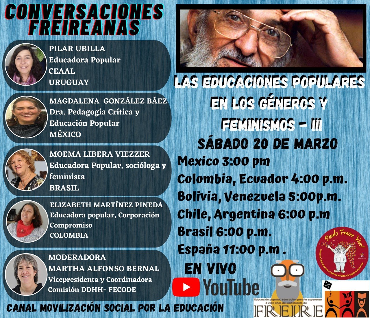 #Freire100años #FreireColombia Les invitamos a continuar con la serie de conversaciones freireanas en esta ocasión con la tercera sesión alrededor de las educaciones populares en los géneros y feminismos. Sábado 20 de marzo 4pm Colombia.
