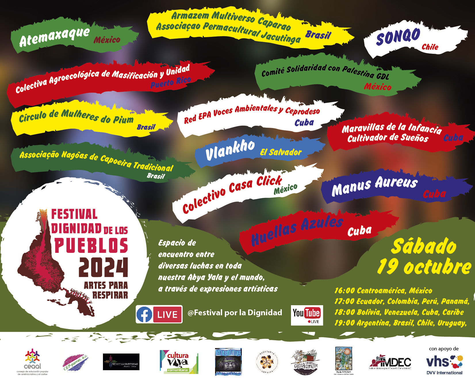 Este sábado 19 de octubre, a las 16 horas (hora México) se realizará la Quinta edición del Festival de la Dignidad de los Pueblos. Artes para Respirar 2024 , que a través del arte y la cultura diversos colectivos, organzaciones, comunidades o pueblos comparten sus luchas, apuestas y propuestas. En esta ocasión participarán 13 experiencias de países como Brasil, Chile, Cuba, El Salvador, México y Puerto Rico.