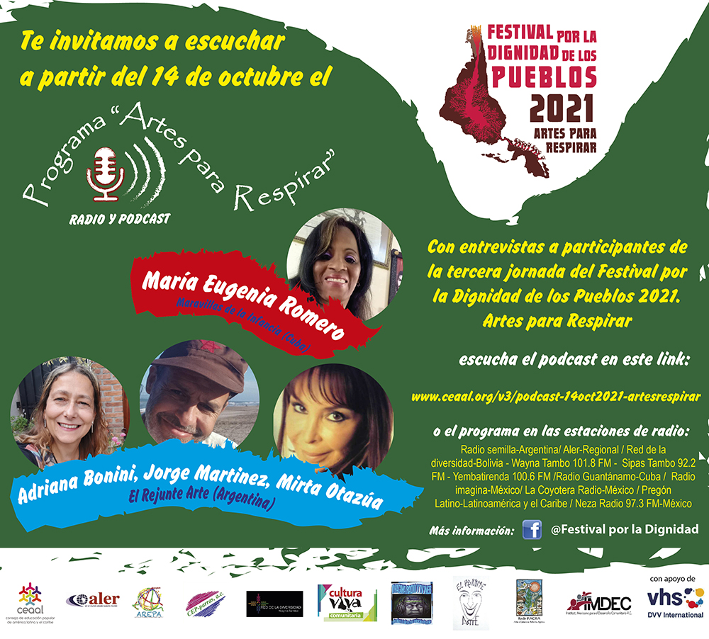 Esta emisión, conducida por María Cianci (Ecuador) y Marcela Copello (Argentina), contiene entrevistas con Marïa Eugenia Romero, de Maravillas de la Infancia (Cuba) y Adriana Bonini, Jorge Martínez y Mirta Otazua, de El Rejunte Arte (Argentina), que participarán en la tercera jornada del Festival, el sábado 9 de octubre de 2021, así como una colaboración de Georgi Andino (Argentina)