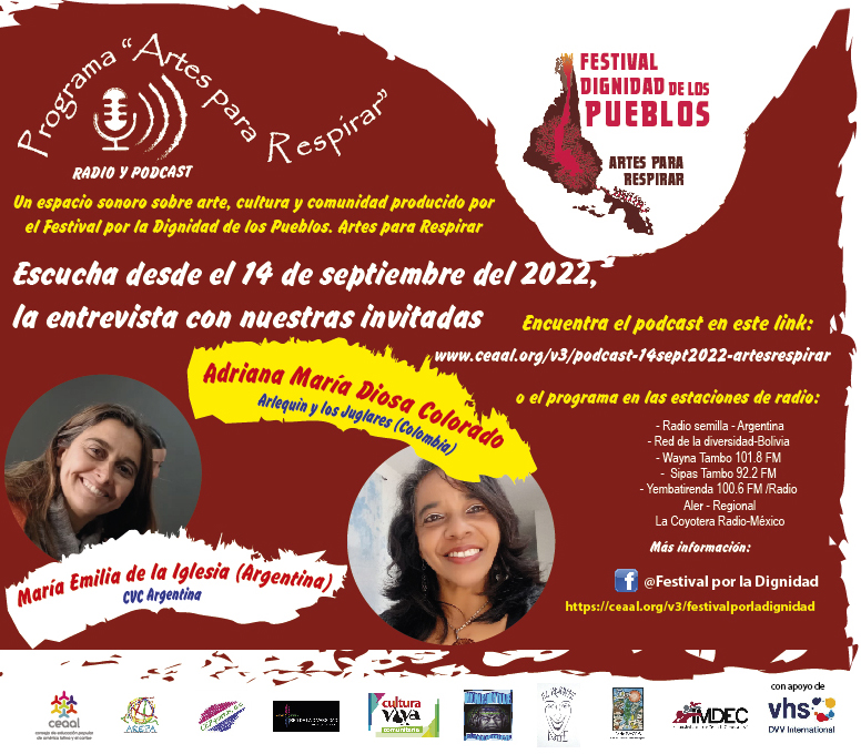 Esta emisión, conducida por Carla Barrrero (Bolivia), contiene la entrevista a Adriana María Diosa Colorado, de Arlequìn y los Juglares y Cultura Viva Comunitaria Colombia, y a María Emilia de la Iglesia (Argentina) de CVC Argentina, donde nos hablan sobre los colectivos a los que pertenecen, y su mirada rumbo al 5º Congreso Latinoamericano de Cultura Viva Comunitaria 2022, que se realizará en Perú, en octubre.