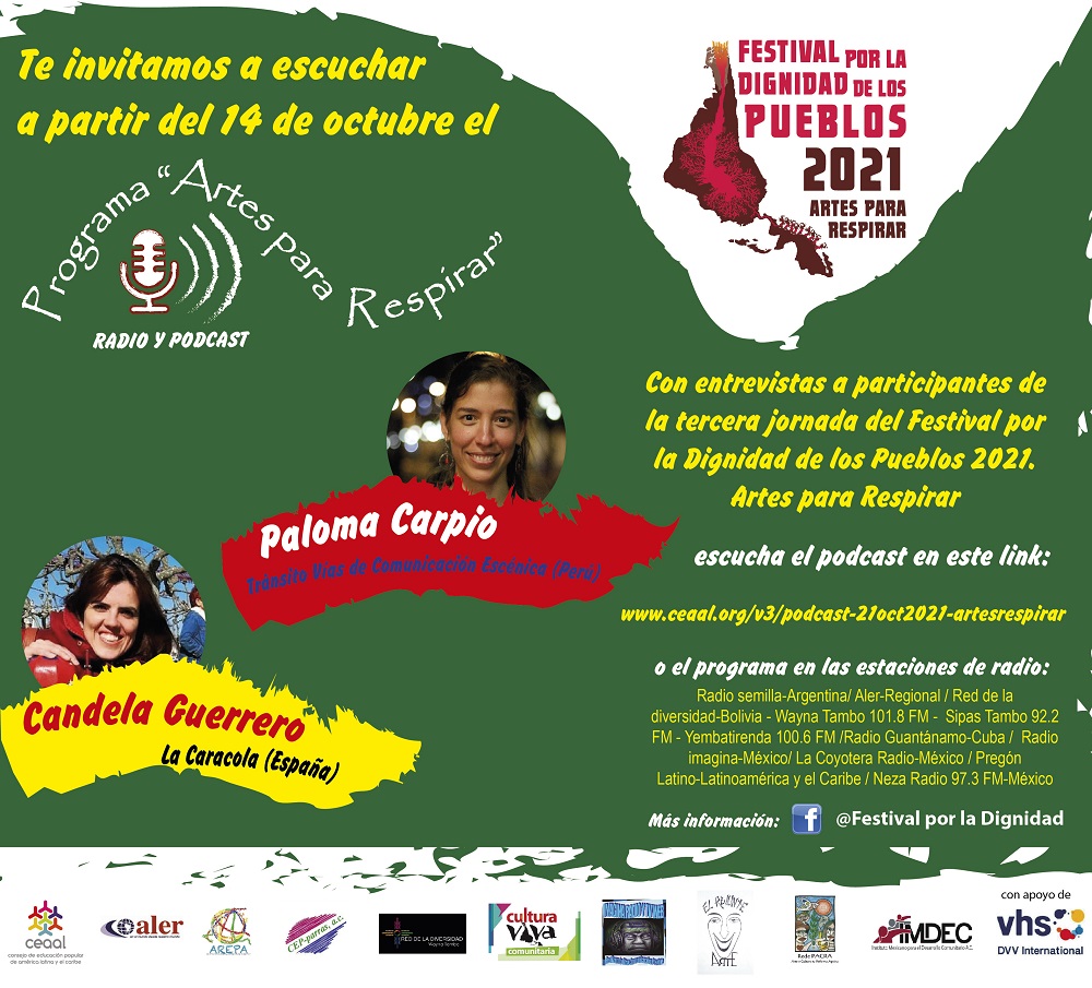 Esta emisión, conducida por Carla Barrero (Bolivia) y Rosy Zúñiga (México), contiene entrevistas con Candela Guerrero, de La Caracola (España) y Paloma Carpio, de Tránsito Vías de Comunicación Escénica (Perú), que participarán en la tercera jornada del Festival, el domingo 14 de noviembre de 2021.
