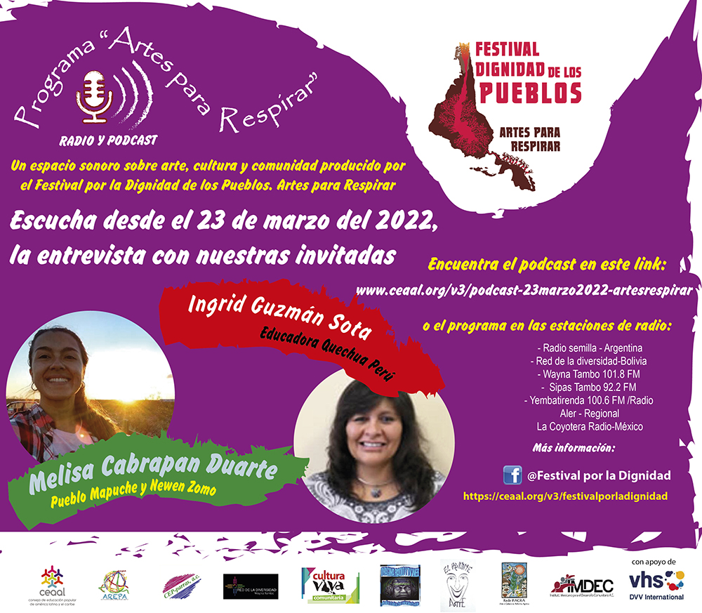 #Podcast – Programa «Artes para Respirar». 23 marzo 2022. Entrevista con Melisa Cabrapán Duarte, del Pueblo Mapuche y organización Newen Zomo, e Ingrid Guzmán Sota, educadora Quechua (Perú)