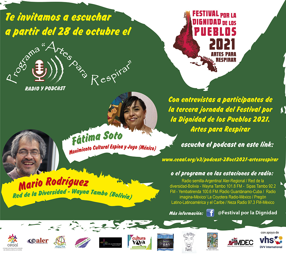 Esta emisión, conducida por Alba Pereyra (Argentina) y Víctor Ibarra (México), contiene entrevistas con Fátima Soto, de Movimiento Cultural Espina y Jugo (Perú) y Mario Rodríguez, de Red de la Diversidad – Wayna Tambo (Bolivia), que participarán en la tercera jornada del Festival, el domingo 14 de noviembre de 2021.