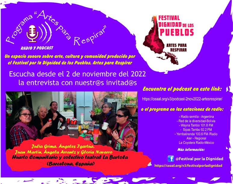 Esta emisión, conducida por Carla Barrero (Bolivia) y Víctor Ibarra (México), que contiene la entrevista a Julia Grima, Ángeles Igartúa, Juan Martín, Ángela Arrantz y Gloria Navarro (España), del Huerto Comunitario La Bartola y colectivo teatral La Bartola (Barcelona, España), quienes nos hablan de este espacio de encuentro vecinal, cultural y artístico enclavado en el corazón de Barcelona, España.