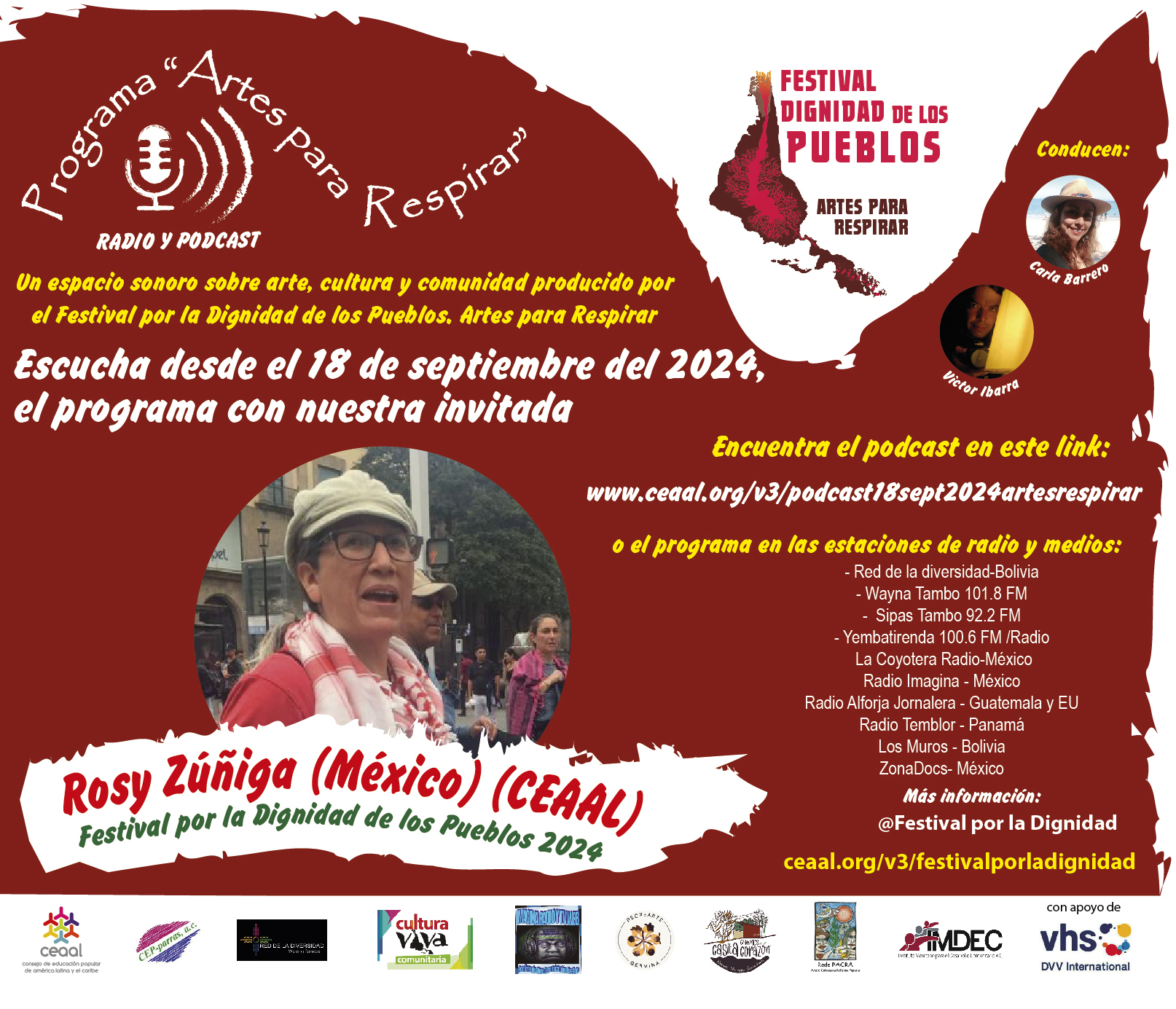En esta emisión, conducida por Carla Barrero (Bolivia), contiene la entrevista con Rosy Zúñiga (México), del CEAAL, donde conversamos sobre el Quinto Festival por la Dignidad de los Pueblos 2024. Artes para Respirar, a realizarse en octubre próximo.