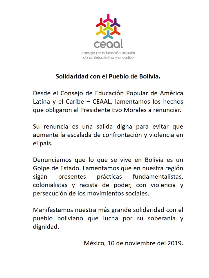 Solidaridad con el pueblo de Bolivia por Comunicación CEAAL Comunicación CEAAL 10 noviembre, 2019 Leave a comment on Solidaridad con el pueblo de Bolivia [siteorigin_widget class=»WP_Widget_Custom_HTML»][/siteorigin_widget] Comunicación CEAAL Ver contenido de Comunicación CEAAL